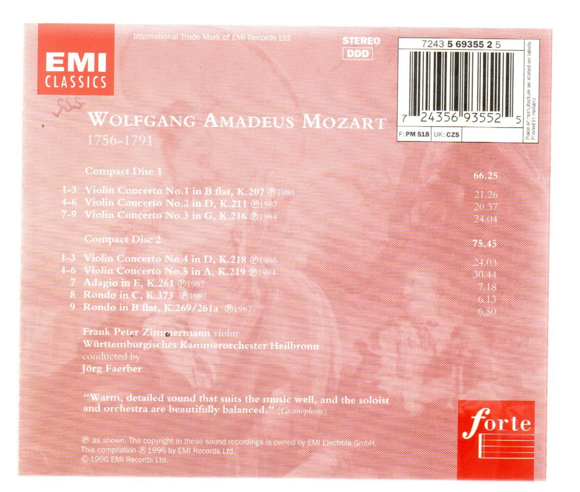CD DUPLO MOZART VIOLIN CONCERTOS: ZIMMERMANN FAEBER