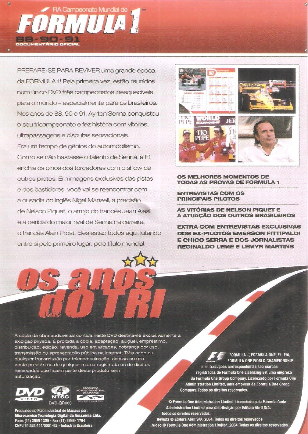 DVD FORMULA 1 88-90-91 OS ANOS DO TRI